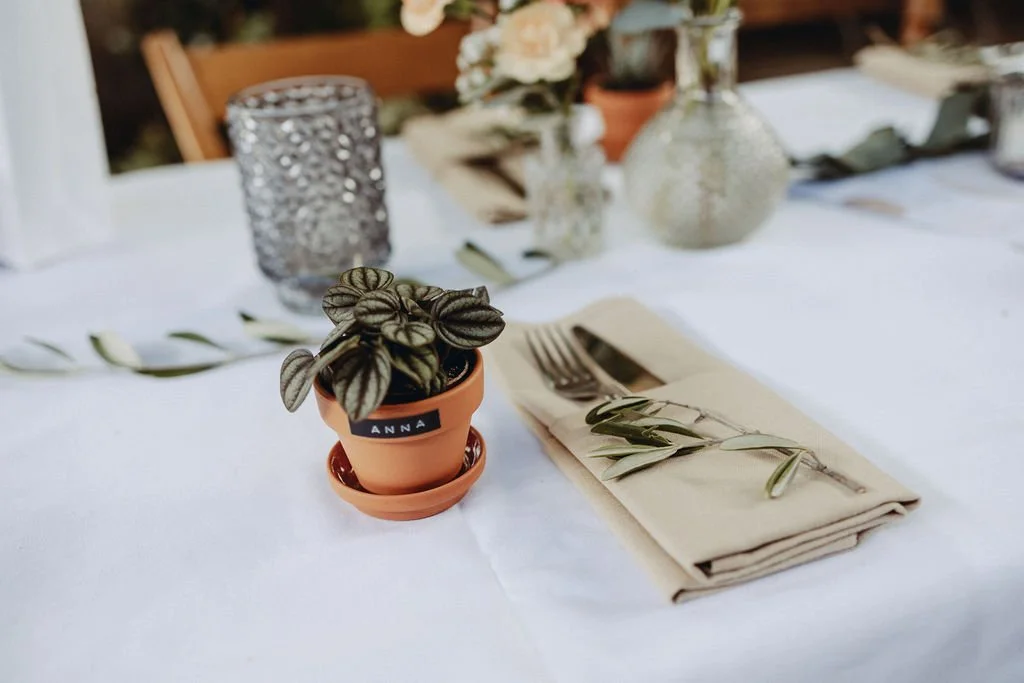 Getopfte Blumen, Kräuter oder kleine Pflanzen sind eine wunderschöne Alternative zu klassischen Schnittblumen. Nach der Hochzeit können sie im Garten, auf dem Balkon oder bei Gästen weiterleben – nachhaltig und emotional wertvoll.